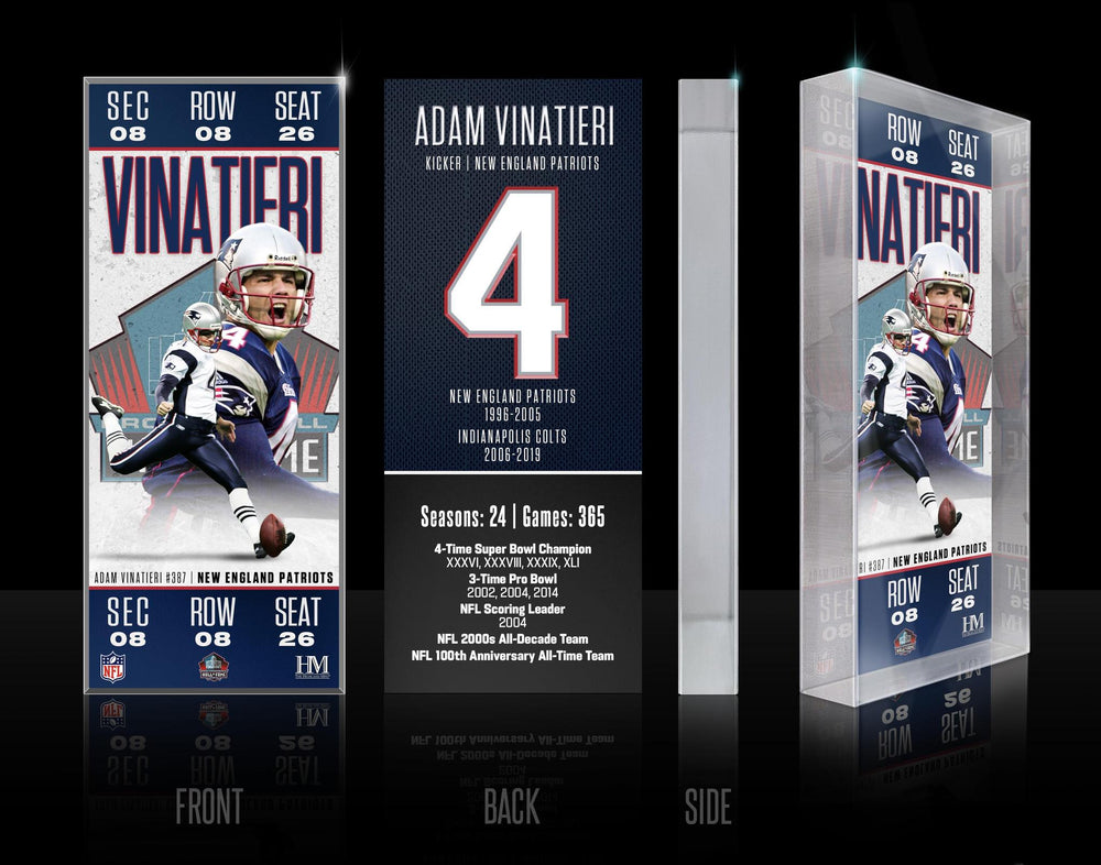 - The New England Patriots Adam Vinatieri Pro Football Hall of Fame Induction 3D Acrylic Souvenir Ticket Block.