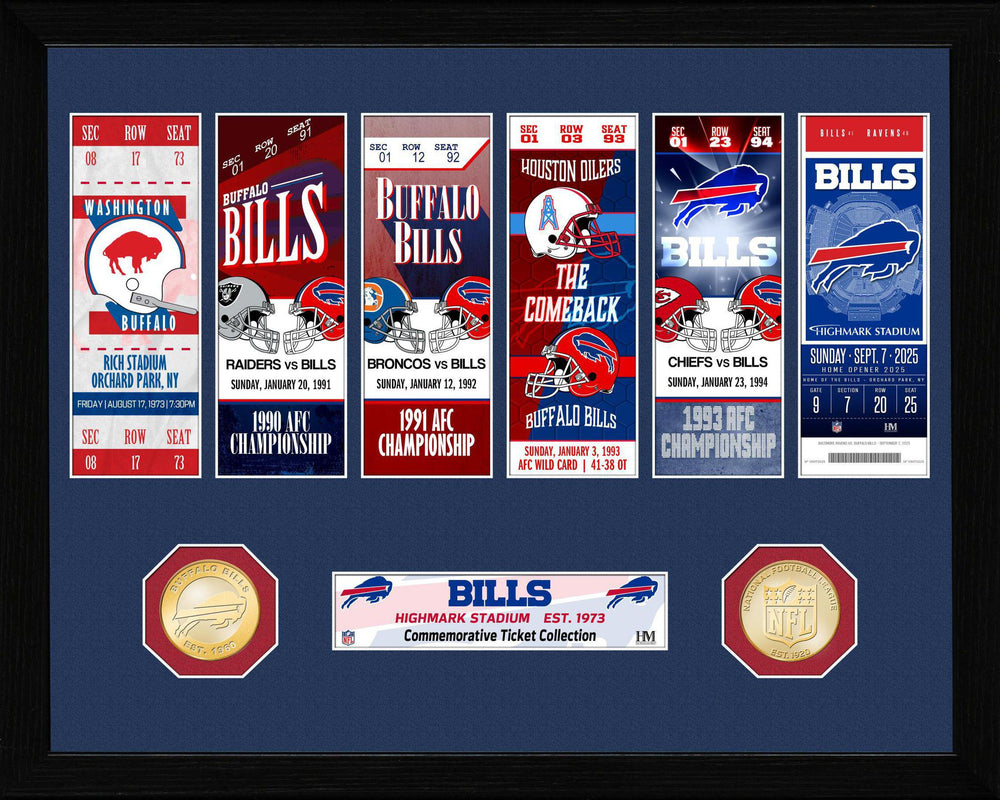 Celebrate the legacy of Highmark Stadium with this 12” x 15” framed collectible. Beneath protective acrylic glass, the display showcases six commemorative tickets honoring some of the most unforgettable games ever played in the stadium’s history. Adding to its exclusivity, the frame also includes two 39mm minted bronze coins—a Buffalo Bills team coin and the NFL coin. Officially licensed by the NFL and proudly made in the USA by The Highland Mint, this collectible is the perfect tribute for any Bills fan.