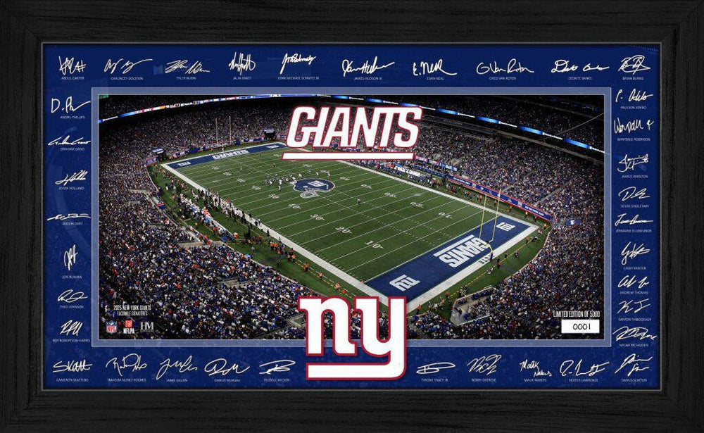 This unique 12"x20" Signature Gridiron frame showcases an individually hand-numbered print of the New York Giants home field, surrounded by the facsimile (replica) signatures of most of the 2025 team roster. Elegantly presented under acrylic glass, this officially licensed collectible is a limited edition of only 5,000 — each accompanied by a certificate of authenticity. Proudly made in the U.S.A. by The Highland Mint!