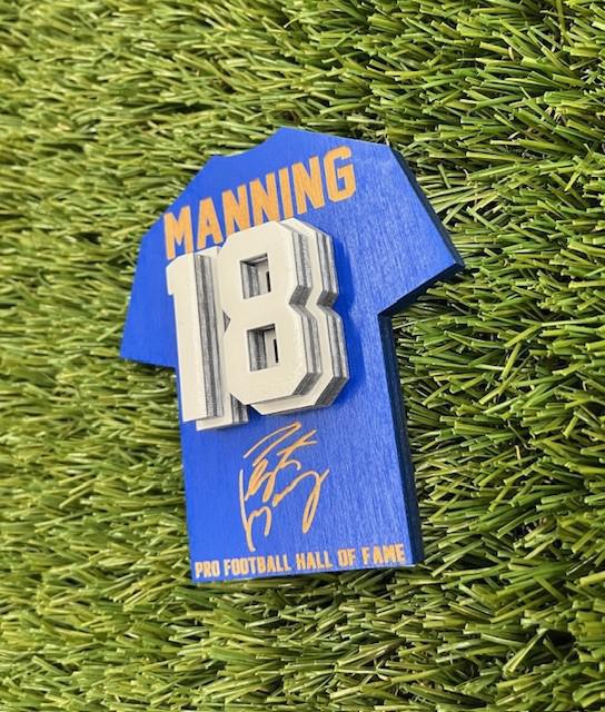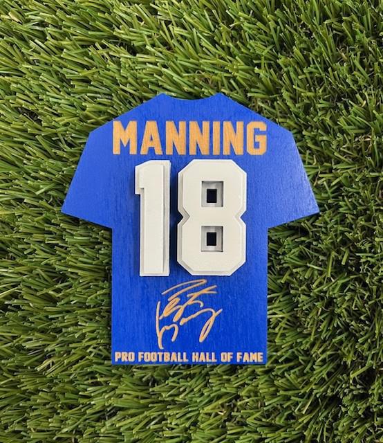 Commemorate the Hall of Fame career of Peyton Manning with this wood jersey jumbo magnet. It features a replica signature of the player, a raised jersey number, and his name printed along the top, with Pro Football Hall of Fame text at the bottom.