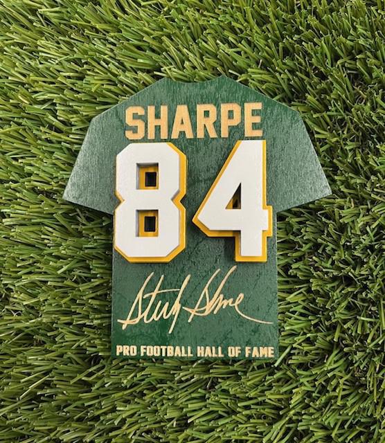 Commemorate the Hall of Fame career of Sterling Sharpe with this wood jersey jumbo magnet. It features a replica signature of the player, a raised jersey number, and his name printed along the top, with Pro Football Hall of Fame text at the bottom.
