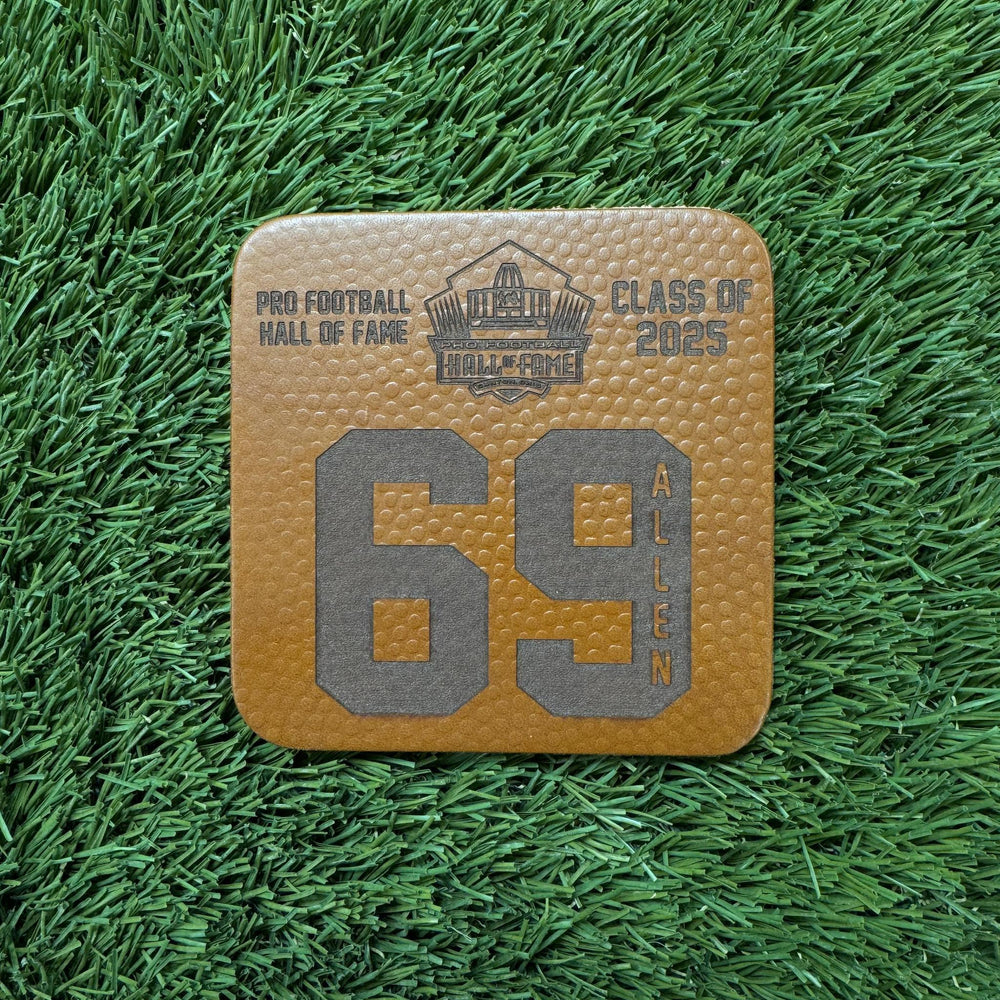 The single Leather Player Coaster features an induction year, last name, and number of your favorite Hall of Famer. Perfect for game day drinks and team spirit, coasters are approximately 4" wide and 4" long. Mix and match to collect all your favorite Hall of Famers. All coasters are made from 100% English Bridle leather, hand embossed replica football dimples, and made in Canton, Ohio by Game Day Feels.