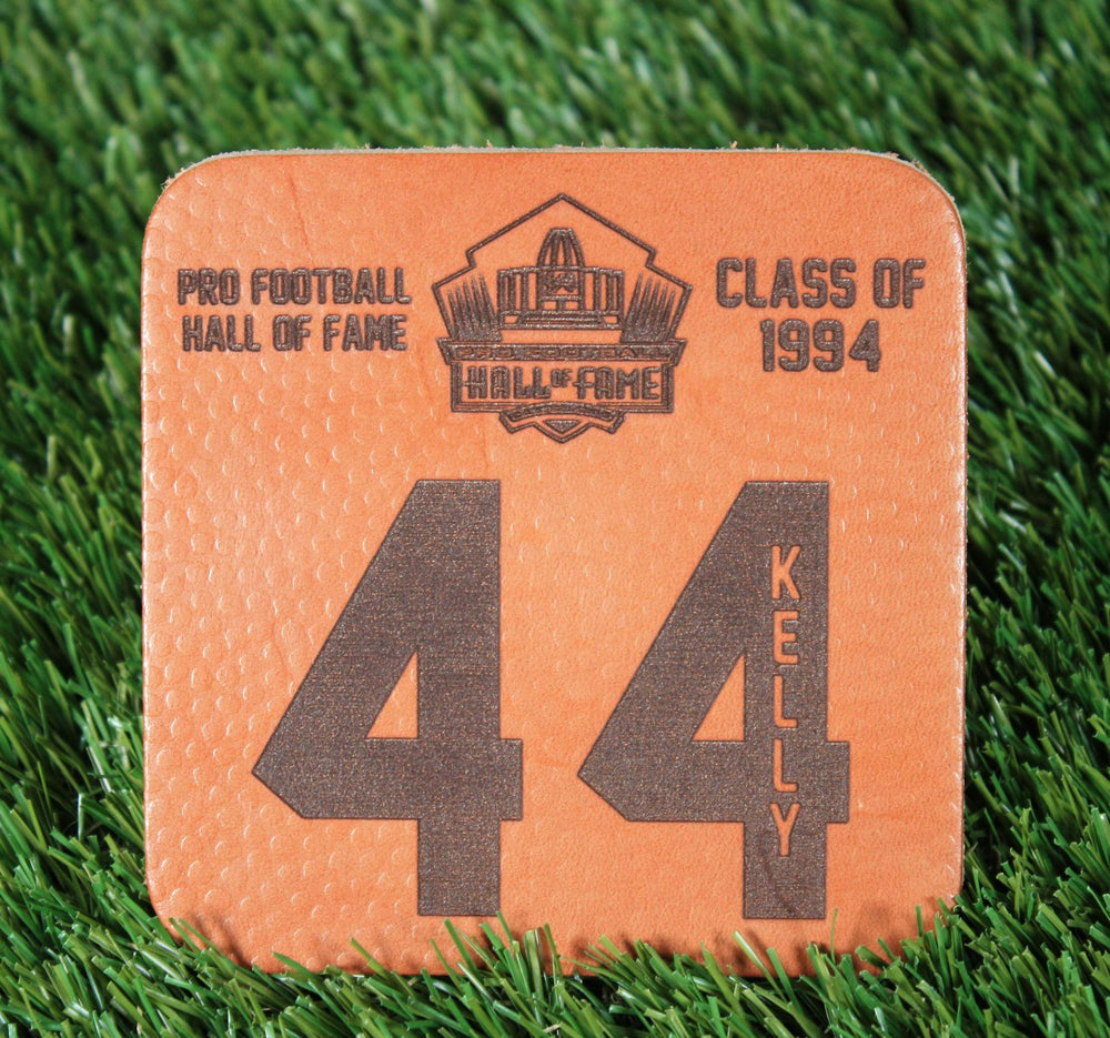 The single Leather Player Coaster features an induction year, last name, and number of your favorite Hall of Famer. Perfect for game day drinks and team spirit, coasters are approximately 4" wide and 4" long. Mix and match to collect all your favorite Hall of Famers. All coasters are made from 100% English Bridle leather, hand embossed replica football dimples, and made in Canton, Ohio by Game Day Feels.