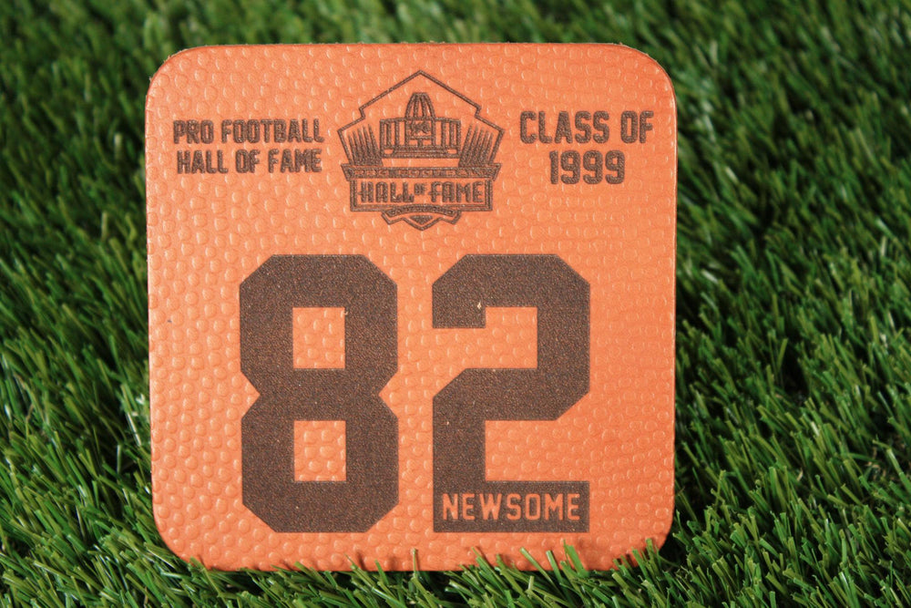 The single Leather Player Coaster features an induction year, last name, and number of your favorite Hall of Famer. Perfect for game day drinks and team spirit, coasters are approximately 4" wide and 4" long. Mix and match to collect all your favorite Hall of Famers. All coasters are made from 100% English Bridle leather, hand embossed replica football dimples, and made in Canton, Ohio by Game Day Feels.