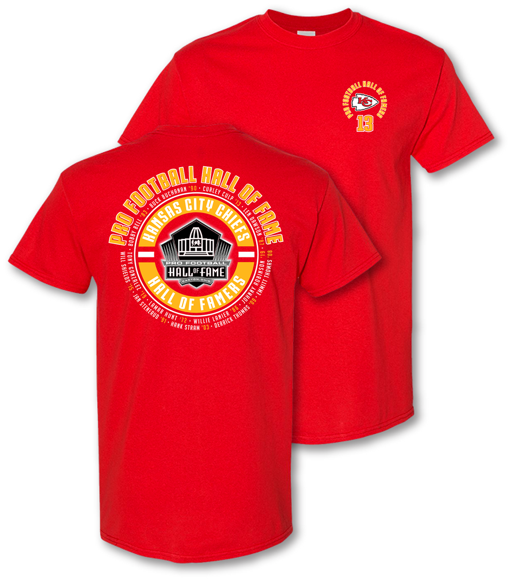 Celebrate the Chiefs Hall of Famers with this exclusive, one-of-a-kind, team color, t-shirt from the Pro Football Hall of Fame!