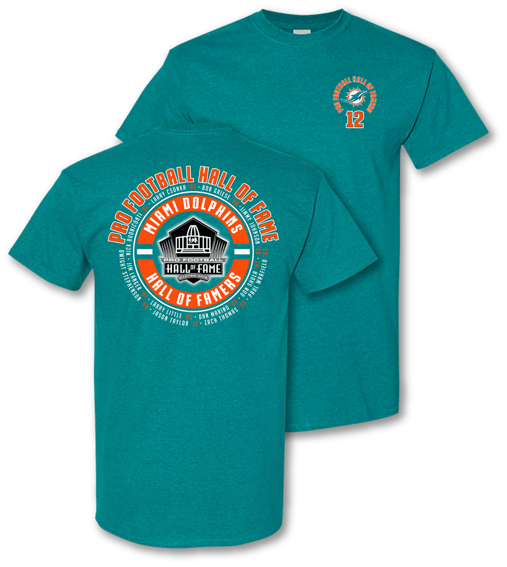 Celebrate the Dolphins Hall of Famers with this exclusive, one-of-a-kind, team color, t-shirt from the Pro Football Hall of Fame!