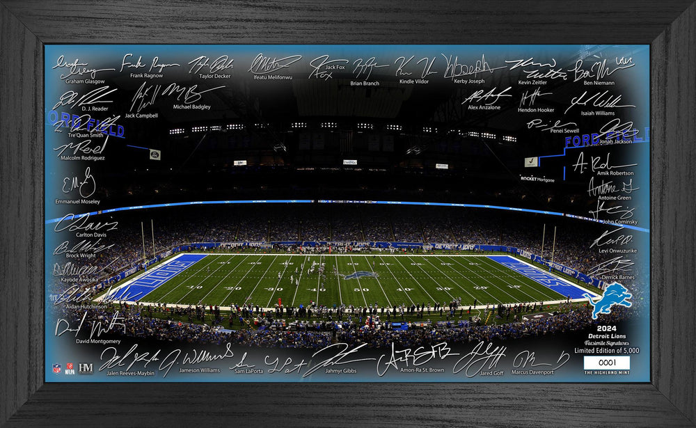 - This unique 12"x20" Signature Gridiron collectible frame features under plexiglass an individually hand numbered home gridiron (field) print with each respective 2024 team rosters, players facsimile (replica) signatures (autographs).